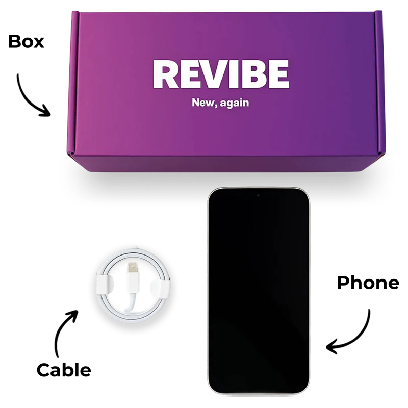 The box design may vary depending on the product and model. Devices in refurbished or pre-owned conditions are delivered in Revibe-branded packaging, while only devices purchased in “New” condition come with the original manufacturer’s box.