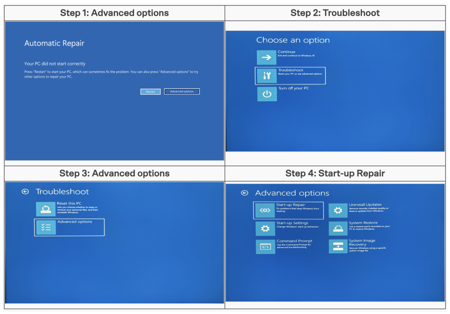 - Go to "Troubleshoot" > “Advanced options” > “Start-up Repair” > “Restart".