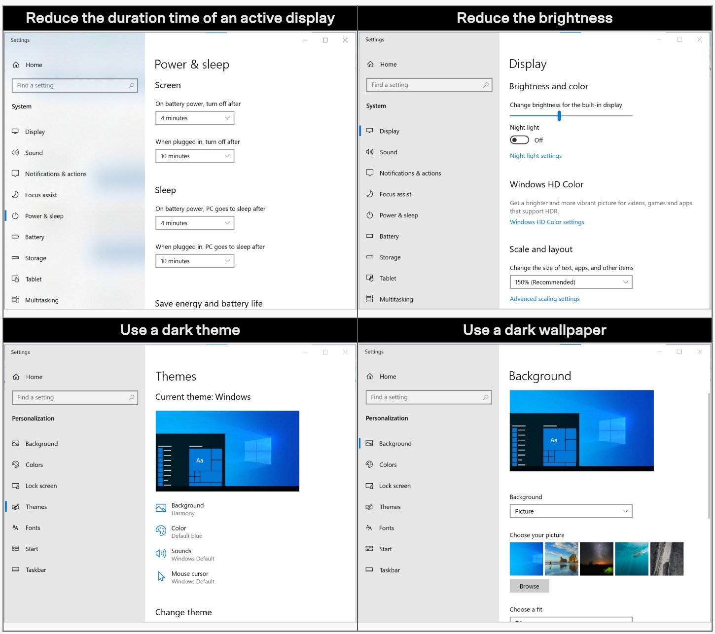 - Use a dark theme:- Go to “Start” > “Settings” > “Personalization” > “Themes” > “Current theme” and choose a dark theme.
